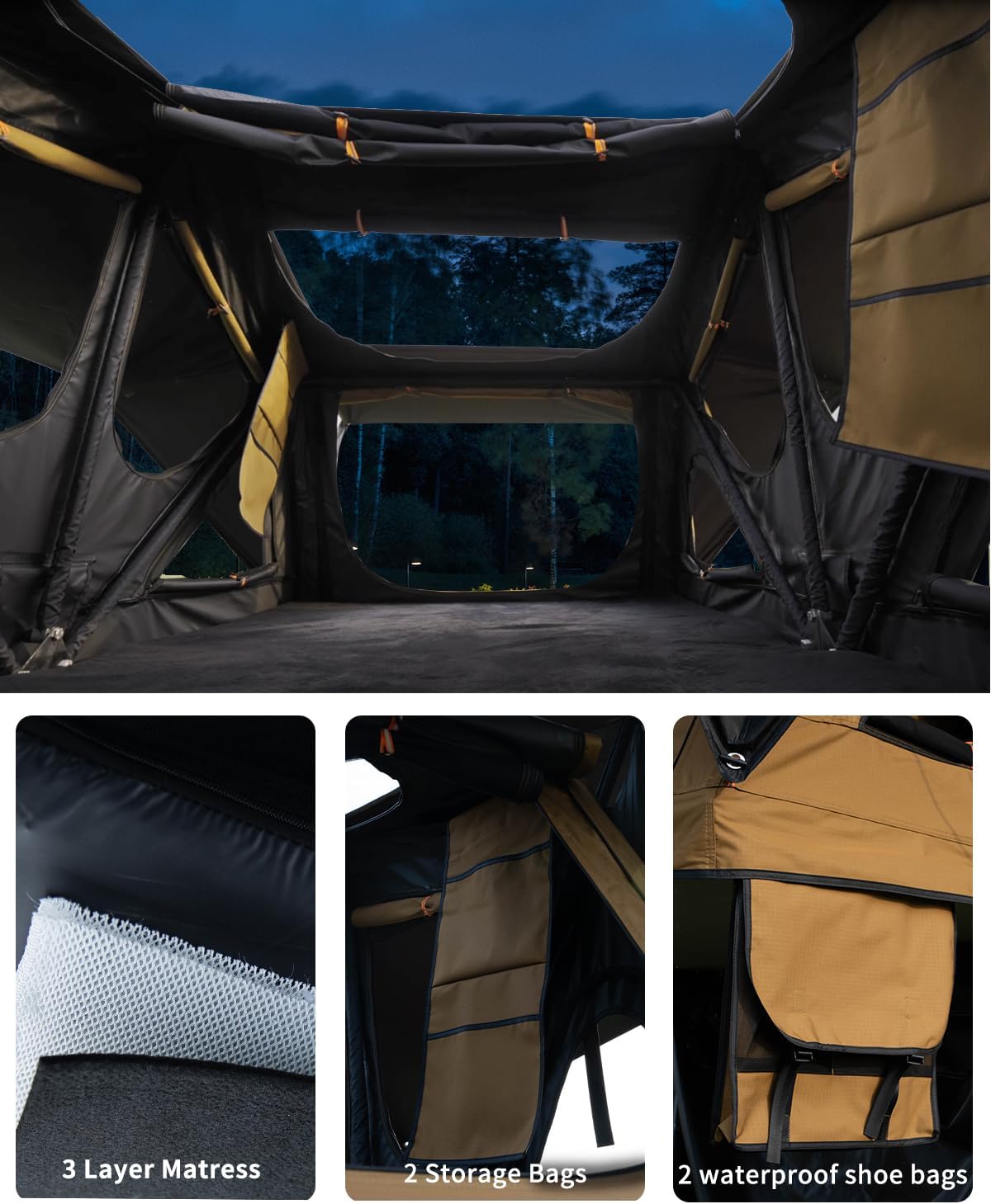 Panoramic Skylight and Storage Solutions: Enjoy breathtaking 360° views with the skylight design, perfect for stargazing or sunbathing. Integrated storage shelves keep your essentials organized and within reach in the camping tent.
