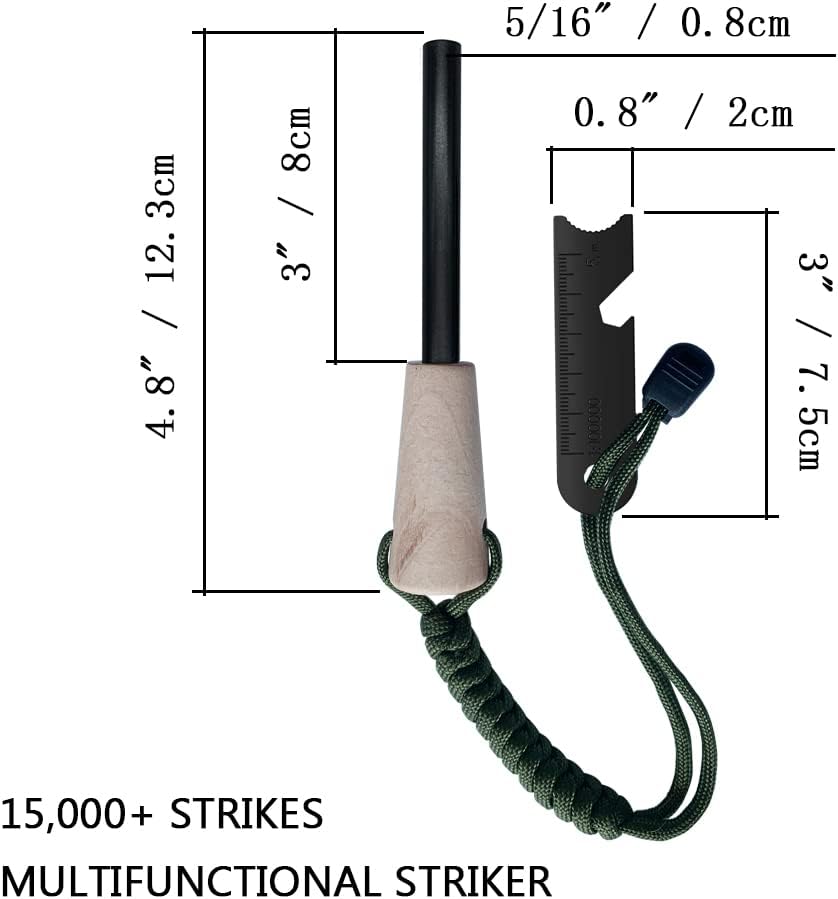 Multifunctional striker: The striker is made of high quality steel with a black plated finish. The size of striker is 3 x 0.8″ and can be used as a bottle opener, hex wrench, scale and map ruler.